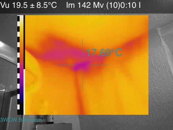 The thermal images in the bathroom did not reveal any significant draughts, but they do show cold air circulating behind the walls. This was confirmed when the bathroom was reorganised, revealing a void behind the sink with plenty of daylight visible through the eaves. Note also in the image of the toilet, the cold water sitting in the cistern.